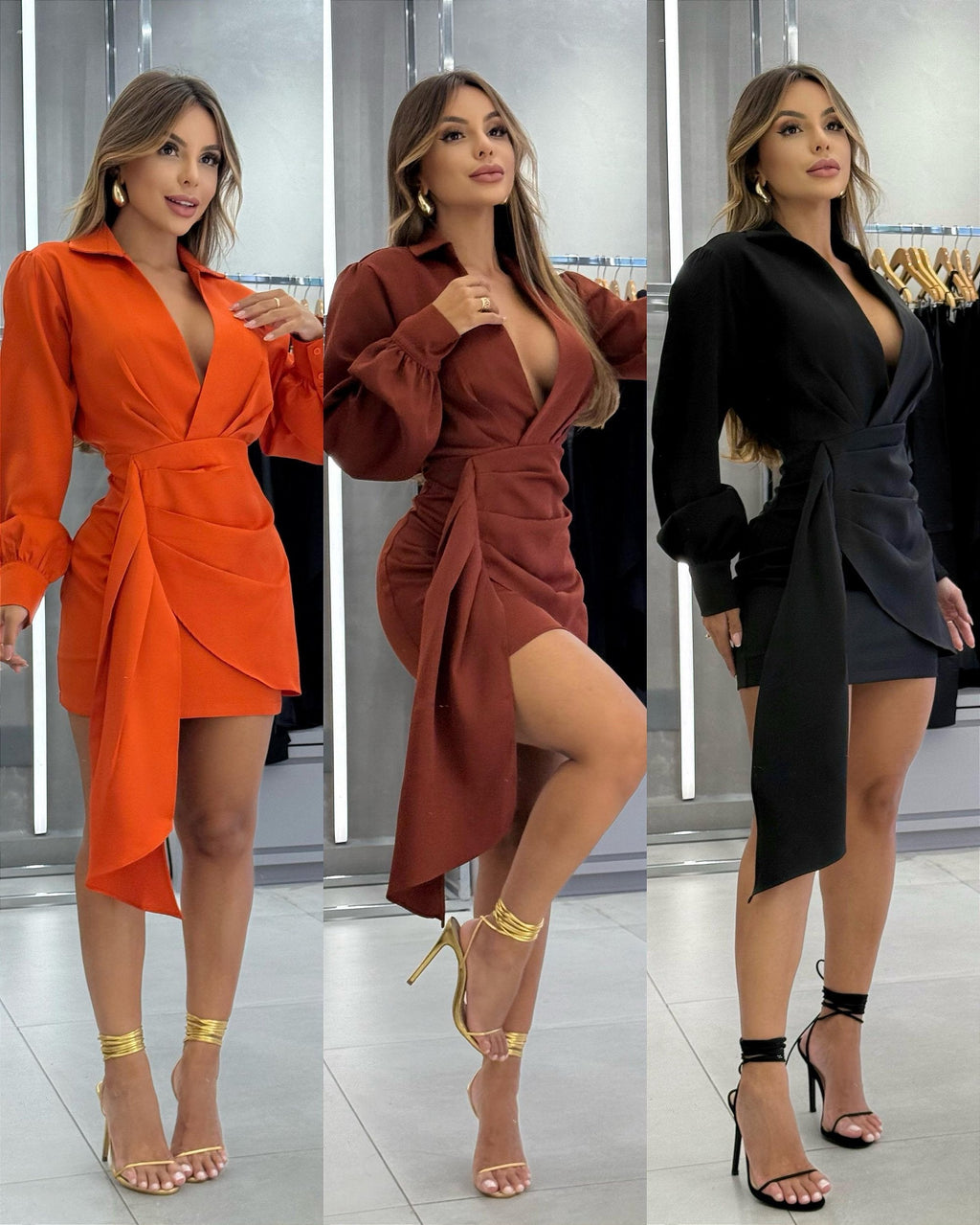✔️ Modelagem assimétrica moderna: o recorte tipo lenço com pregas cria movimento e leveza ao caminhar. ✔️ Decote em V transpassado com gola: valoriza o colo com elegância sem excessos. ✔️ Mangas bufantes: toque romântico e atual que equilibra estrutura e suavidade. ✔️ Cintura marcada com faixa sobreposta: destaca a silhueta com charme e sutileza. ✔️ Detalhe triangular nas costas: surpresa refinada que deixa o visual ainda mais único. ✔️ Tecido confortável com forro interno: beleza e bem-estar em cada uso.
